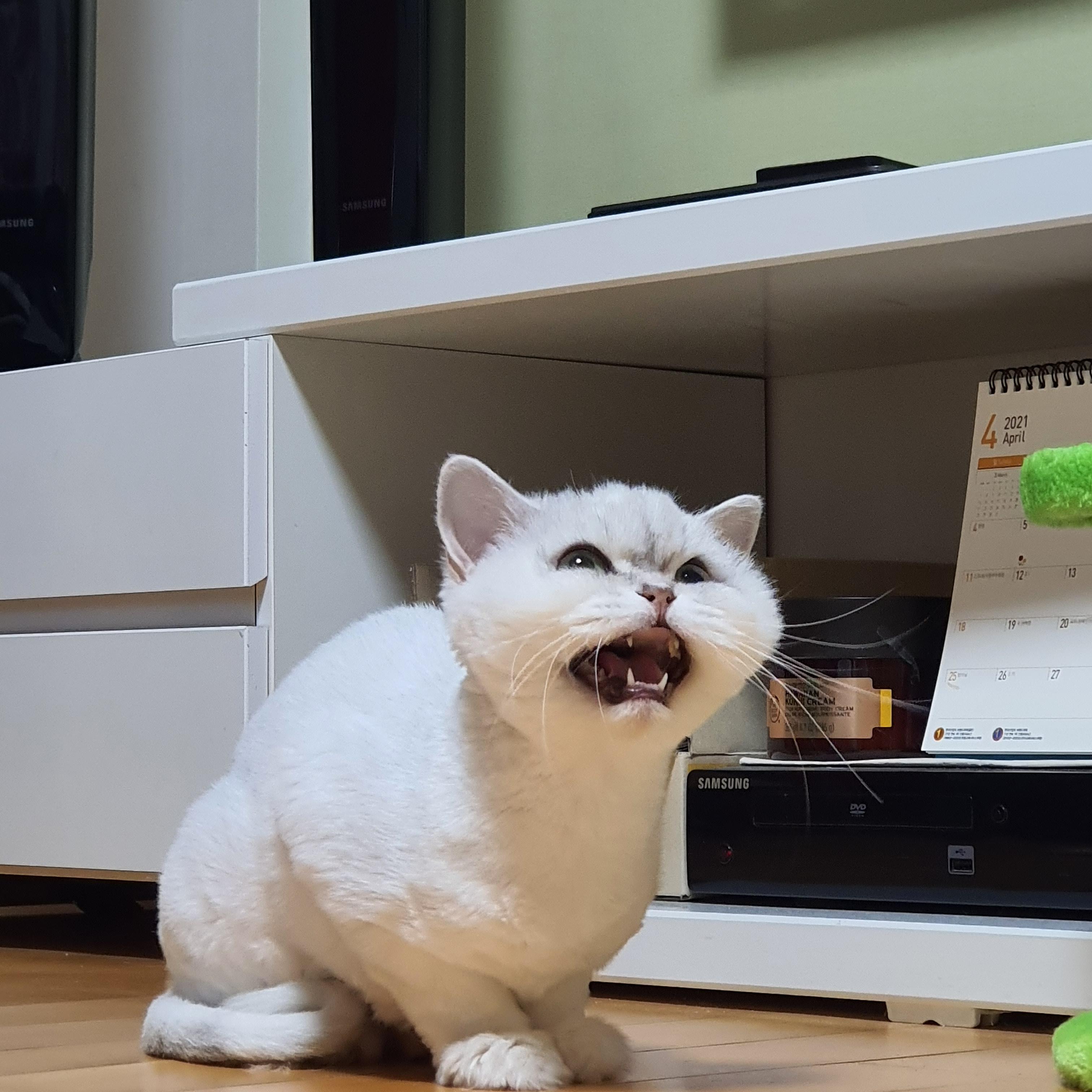 앙칼진 표정이지만 소리는 정말 작습니다. 강아지가 우렁차게 월!!월!!하고 짖는다면 고양이는 저 멀리서 왜애옹오...하는 느낌입니다. 강아지는 짖으면 깜짝 놀라는데 고양이는 방 문을 닫고 있으면 '우는건가..? 아닌가..?' 할 때도 있습니다. 그리고 잘 울지 않습니다. 원래 성묘는 사람한테 말(?) 걸 때만 운다고 하더라구요.
