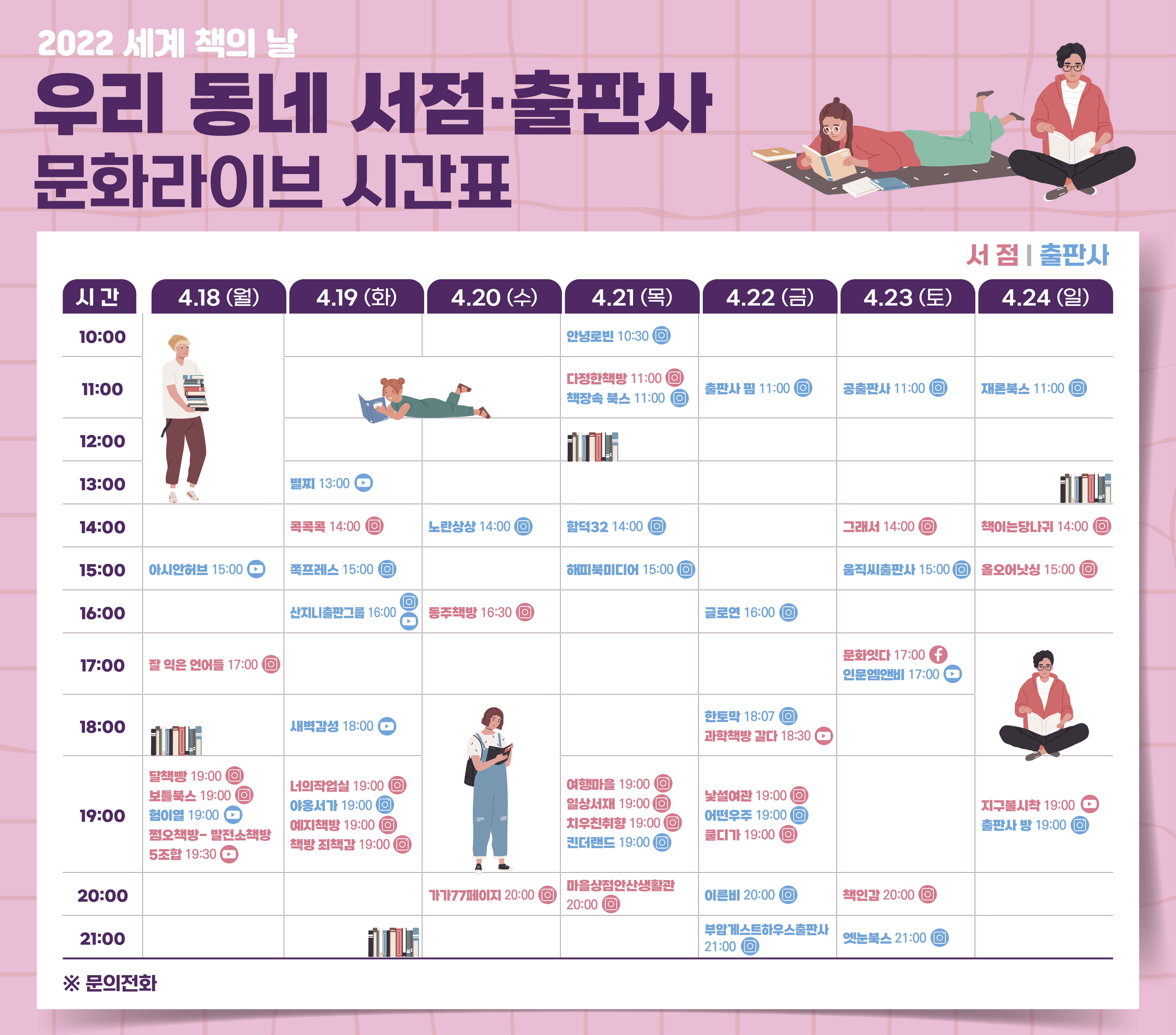 4월 18일부터 24일, 일주일 동안 다양한 서점 및 출판사에서 온라인 라이브로 독서프로그램행사를 진행합니다.