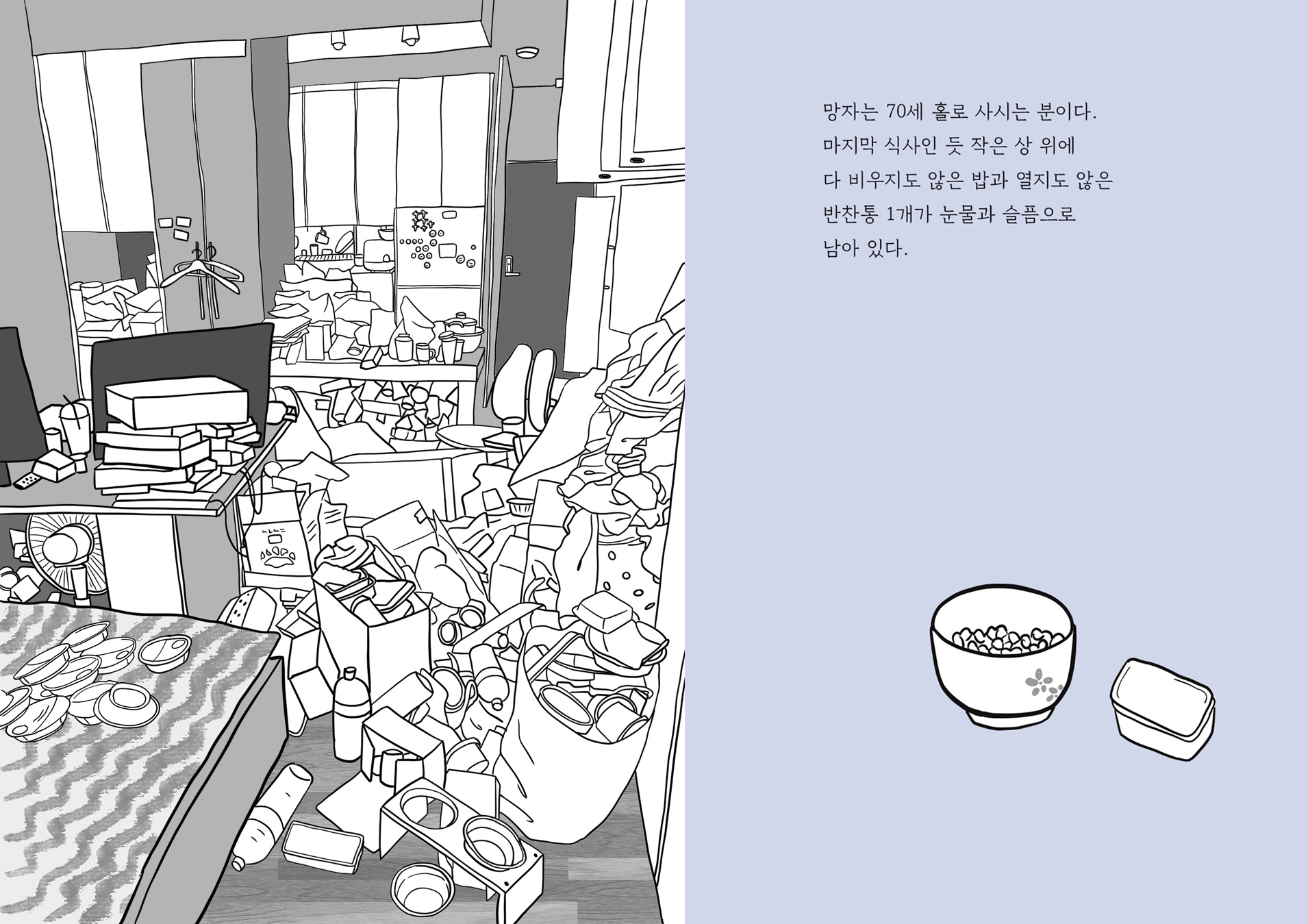 Q. 저자가 처음 보내온 원고에는 고독사 현장의 사진이 날것 그대로 실려 있었죠. 물론 사진을 그대로 책에 실을 수도 있었지만 편집 과정에서 사진이 아닌 일러스트로 대체하기로 결정했습니다.
