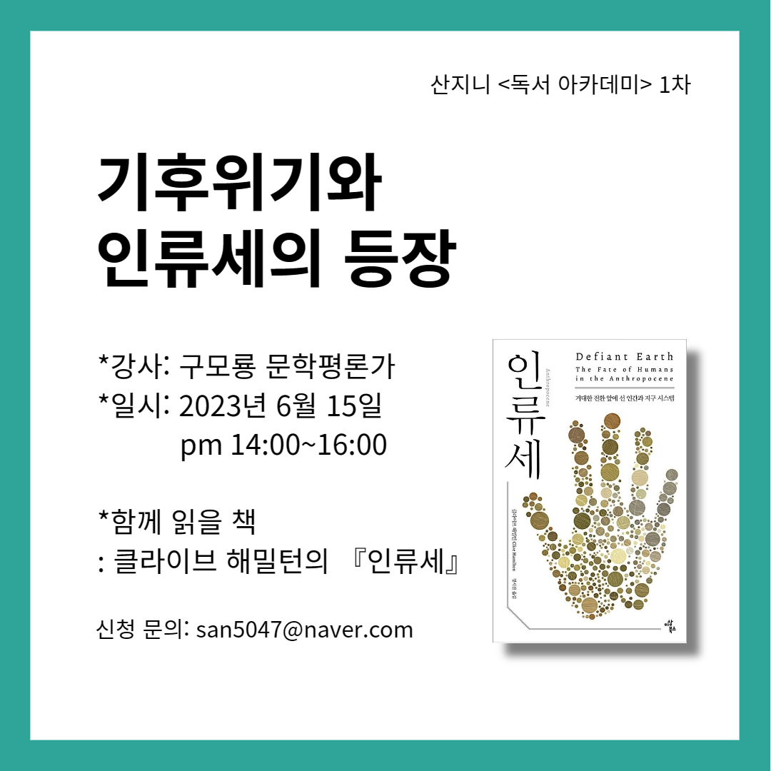 6월 15일 이루어질 1강은 '기후위기와 인류세의 등장'을 골자로 하여 구모룡 문학평론가와 함께 클라이브 해밀턴의 『인류세』에 대해 함께 이야기해보려 합니다.