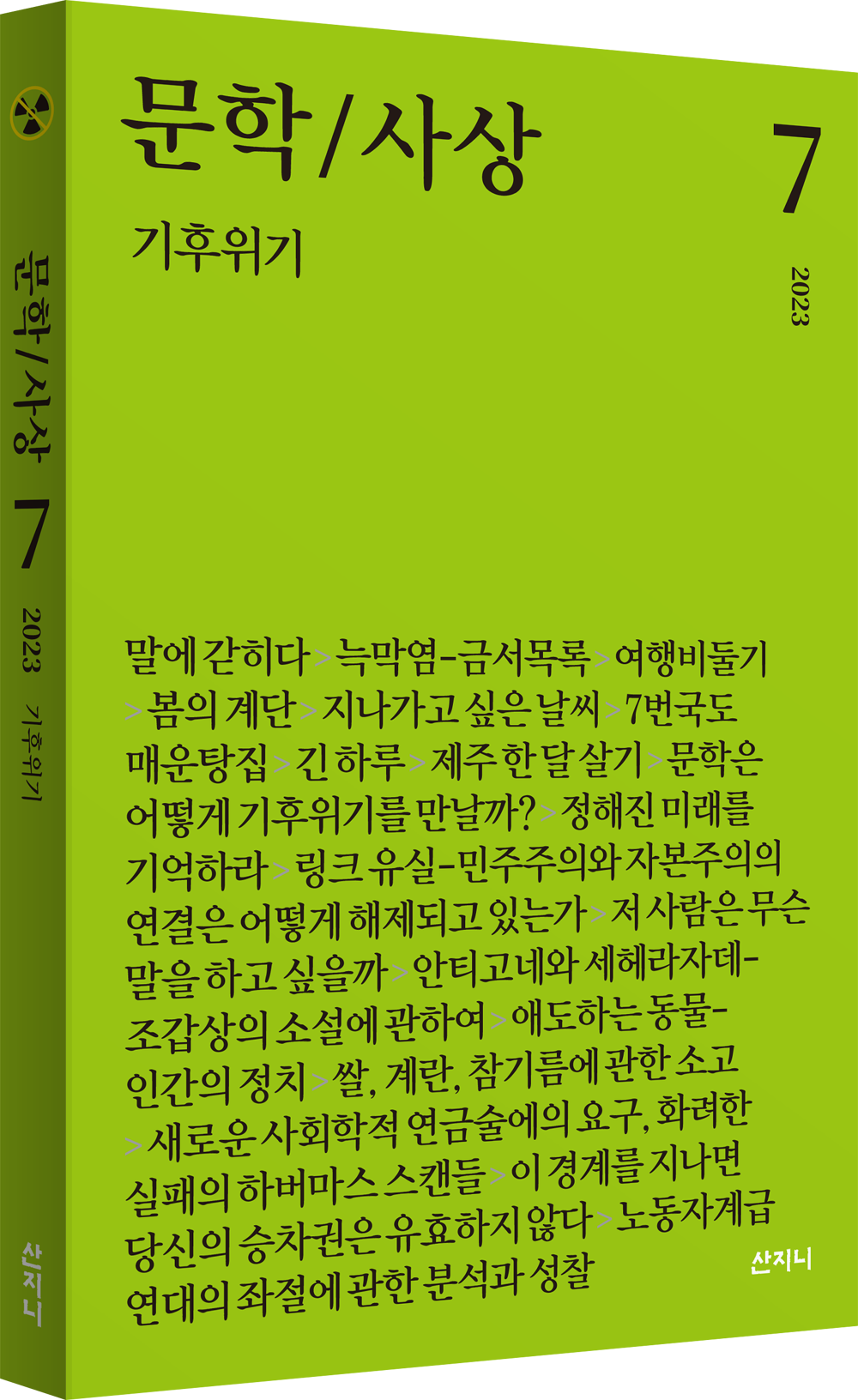 2023년 상반기 산지니에서 출간하고 있는 비평잡지 <문학/사상> 7호에서는 '기후위기'를 주제로 잡지를 기획하였습니다. 이번에 진행되는 독서 아카데미는 이러한 <문학/사상> 7호 기획의 연장선상에서 기후위기 시대, 인류세 시대에 접어든 현재의 지구에 대한 경각심을 일깨우고 문학적 차원에서 이를 논의하기 위해 만들어졌습니다.