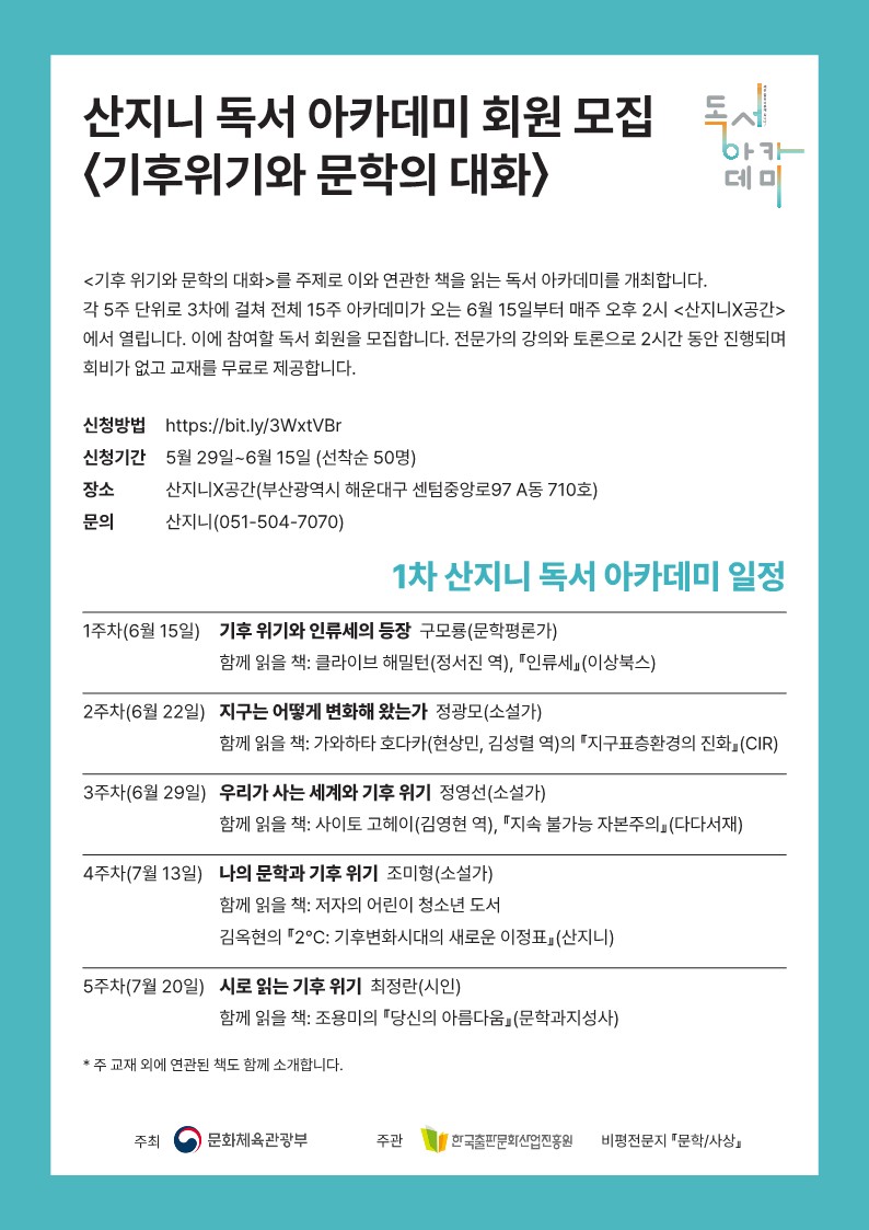 | 산지니 독서 아카데미 2차 회원모집_기후위기와 문학의 대화 (0) | 2023.07.11 |