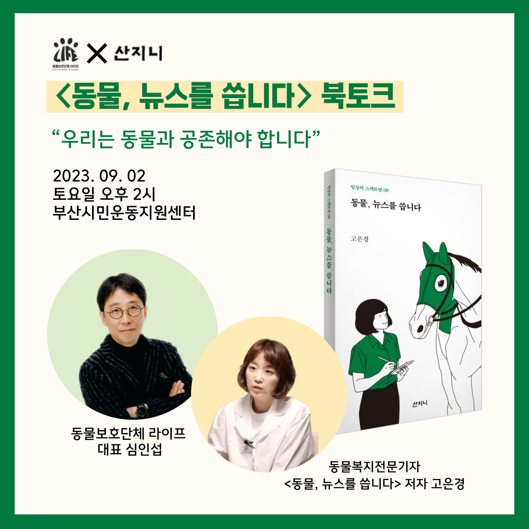 이번 북토크를 통해 <동물, 뉴스를 씁니다>의 저자이자 동물전문 뉴스레터 애니로그를 발행하고 있는 고은경 기자와 부산동물보호단체 라이프 심인섭 대표의 이야기를 듣고자 합니다.