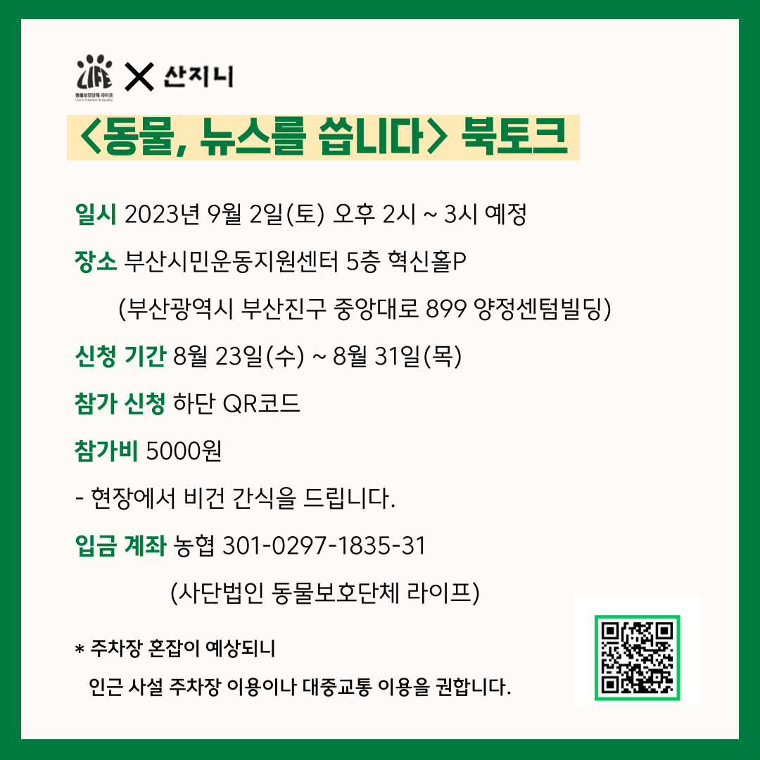 동물보호단체 라이프와 함께 <동물, 뉴스를 씁니다> 북토크가 열립니다.