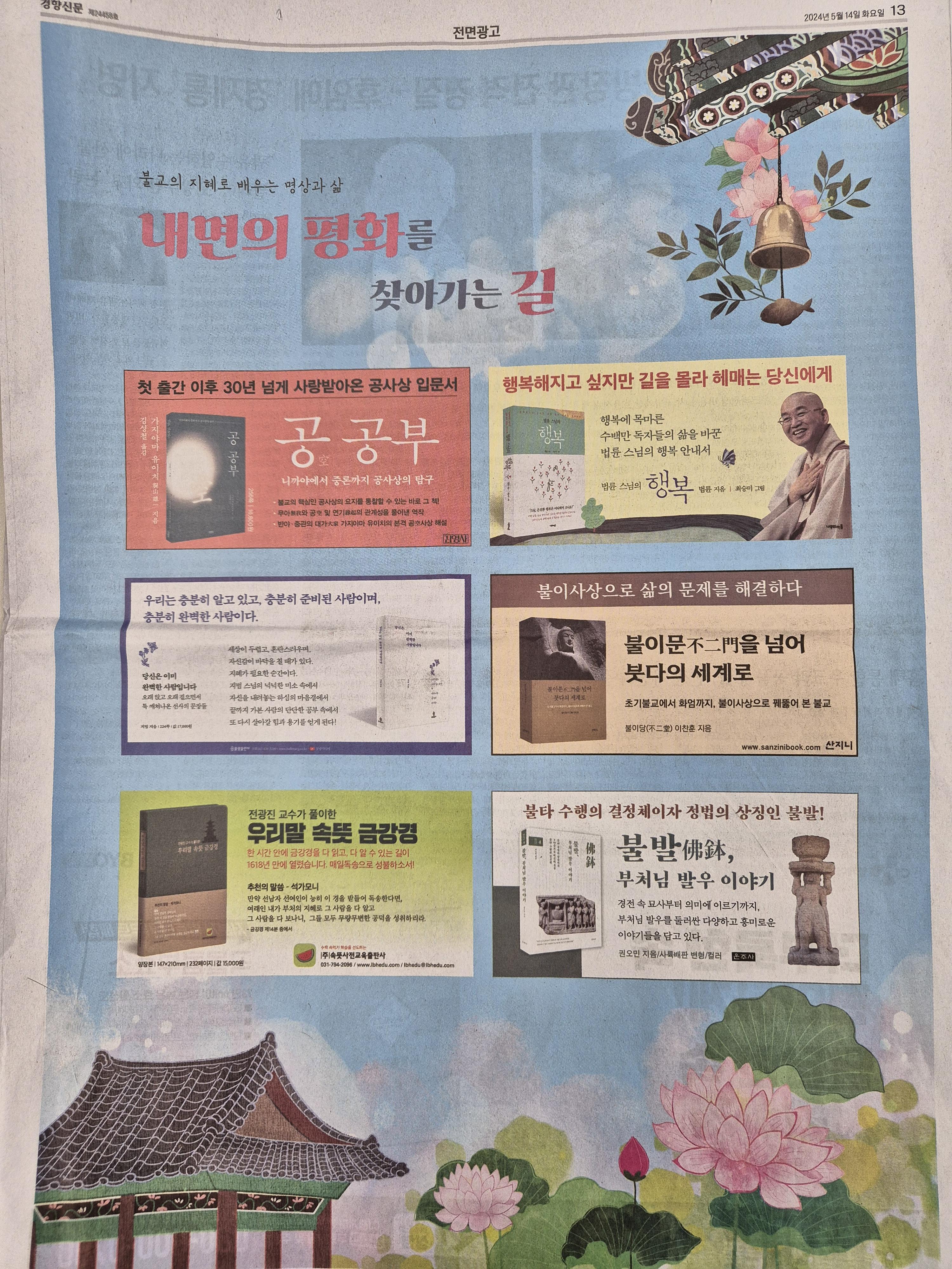 5월 15일(음력 4월 8일) '부처님 오신 날'을 맞이하여 불교의 지혜로 배우는 명상과 삶을 통해 '내면의 평화를 찾아가는 길'을 전하는 여러 불교 도서가 경향신문 전면광고를 통해 소개되었습니다.