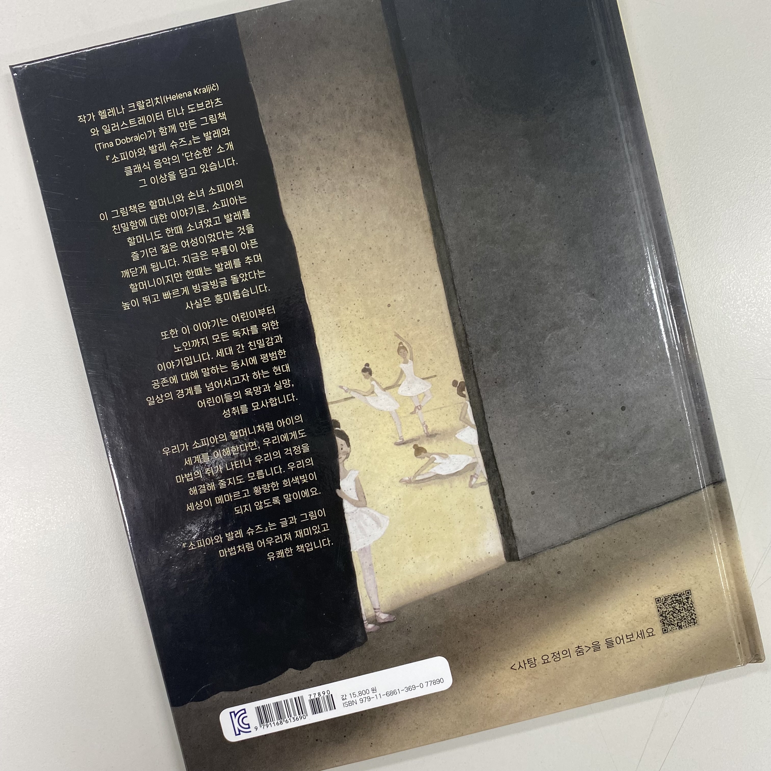 라디오에서 흘러나오는 음악과 할머니의 오르골이 연주하는 멜로디를 들으며 소피아는 그 소리가 마치 빗방울이 창문을 두드리는 것 같다고 말해요. 소피아가 발레를 시작하게 된 계기도 바로 이 음악, <사탕 요정의 춤>을 들으면서부터입니다. 『소피아와 발레 슈즈』에는 여러분이 소피아와 함께 <사탕 요정의 춤>을 들을 수 있도록 QR코드가 수록되어 있어요. 이 코드를 통해 언제든지 이 특별한 음악을 감상하며 소피아의 이야기에 더욱 빠져들 수 있어요.