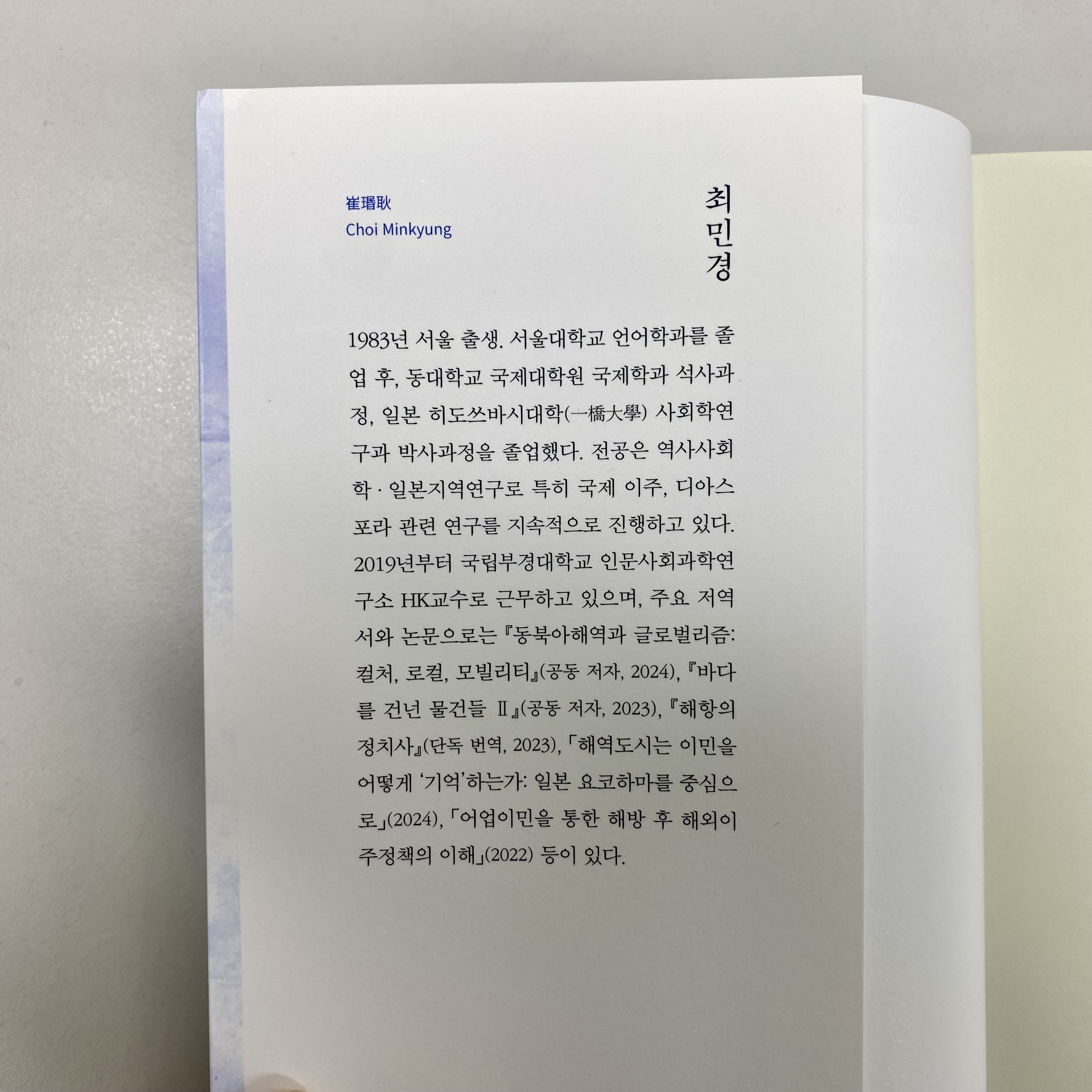 『재일한인의 해역인문학』은 인문학적 시각에서 동북아해역의 역동성을 연구하는 국립부경대학교 인문한국플러스사업단의 기획 아래 출간되었다. 저자 최민경 부경대학교 교수는 일제강점기 한반도에서 일본으로 이동을 가능케 한 교통망과 재일한인의 생활세계였던 해역, 그리고 그 사이에서 피어난 다양한 차원의 인문네트워크 분석을 통해 일본과 한국 사이에 역동적으로 전개되었던 관계를 살핀다. 디아스포라들이 해역을 배경으로 형성했던 민간 교류의 흔적을 따라 재일한인의 발자취와 그 속에 녹아 있는 바다의 흔적을 파악해 보자.