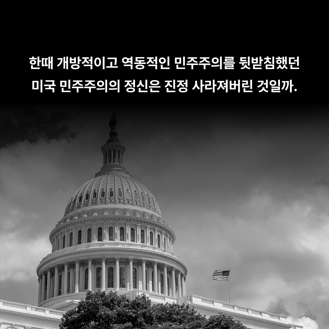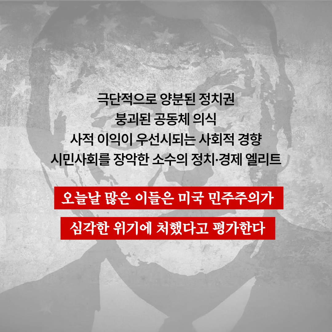 오늘날 많은 이들이 미국 민주주의가 심각한 위기에 처했다고 평가한다. 정치권은 극단적으로 양분되어 있고, 공동체 의식은 붕괴되었으며, 사회 전반에 사적 이익이 우선시되는 경향이 확산되었다는 것이다. 일부 학자들은 소수의 부유한 정치·경제 엘리트가 시민사회를 장악했고, 중산층은 이러한 흐름에 저항할 힘을 상실했다고 분석한다. 한때 개방적이고 역동적인 민주주의를 뒷받침했던 미국 민주주의의 정신은 진정 사라져버린 것일까.
