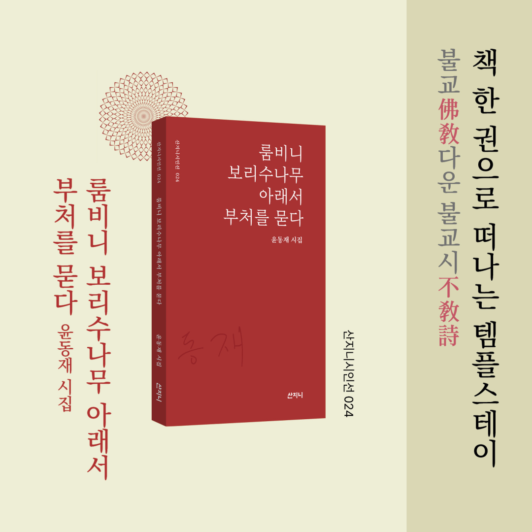 윤동재 시인의 『룸비니 보리수나무 아래서 부처를 묻다』(산지니시인선 24)는 이러한 현대인들의 갈망을 충족시켜 줄 불교 시들을 모은 시집이다. 윤동재 시인은 자신의 경험을 바탕으로 하되, 상상력을 더해 이야기를 들려주듯 시를 써왔다. 이번 시집에서는 그가 절집을 여행하면서 보고 느끼고 생각한 바를 시로 풀어냈다. 이른바 ‘절집 몽유기행시’이다. 시집에 수록된 70편의 시 중 대다수는 한국 각지의 절을 배경으로 한다. 서울 진관사, 영주 부석사, 영암 도갑사 등 절집의 풍경과 그곳에서 만난 사유는 독자들에게 마치 템플스테이를 하는 듯한 경험을 선사할 것이다.