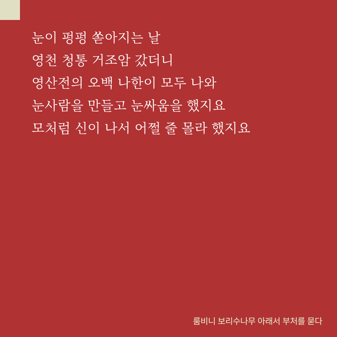 “부처님 덩치가 작아 봐라/ 힘이 없어 무씬 일을 하시겠노”(「관촉사 은진미륵님」)라며 외모가 볼품없는 은진미륵을 대변해 세상에 모난 존재가 없음을 말한다. 이는 겉모습만으로 모든 것을 판단했던 이들에게는 따끔한 죽비가 될 것이다. 또한, “고추장 잘 담그는 것이 면벽 정진과 다르지 않”(「만일사 고추장 불보살」)다며 일상 속 모든 일이 수행이고, 그것을 잘 해내면 그게 득도라는 메시지를 전한다. 한글대장경을 읽는 각시붓꽃(「봉선사 각시붓꽃」)과 부처님 무릎 아래 모여 부처님 말씀을 한마디도 빠트리지 않고 들었다는 구절초(「영평사 구절초」)를 통해 세상의 모든 존재가 부처라고 일러주기도 한다. 표제작 「룸비니 보리수나무 아래서 부처를 묻다」에서는 스스로 깨닫는 것의 중요성을 강조한다. 윤동재 시인은 불교와 시라는 어려운 조합을 친숙한 언어와 시공간을 넘나드는 꿈같은 장면들로 풀어내며 독자에게 깊은 울림을 전한다.