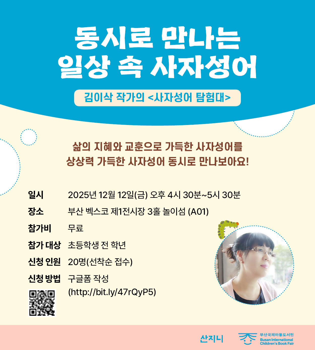 국내 유일의 국제아동도서전인 2025 제2회 부산국제아동도서전에서 김이삭 작가와의 즐거운 책놀이 프로그램이 열립니다. ✍삶의 지혜와 교훈으로 가득한 사자성어를 김이삭 작가의 상상력으로
