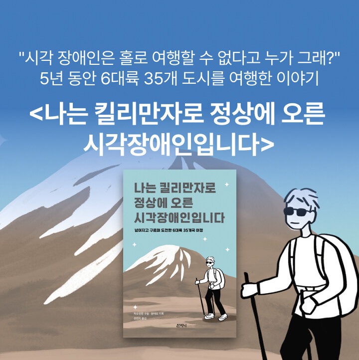 우리는 대부분 ‘눈으로 본 세계’를 중심으로 여행을 말합니다. 아름다운 풍경, 장대한 자연, 찬란한 도시의 이미지들…. 그러나 세계에는 보이지 않아도 느껴지는 것들이 훨씬 많습니다. 『나는 킬리만자로 정상에 오른 시각장애인입니다』는 바로 그 세계를 증명하는 책입니다.
