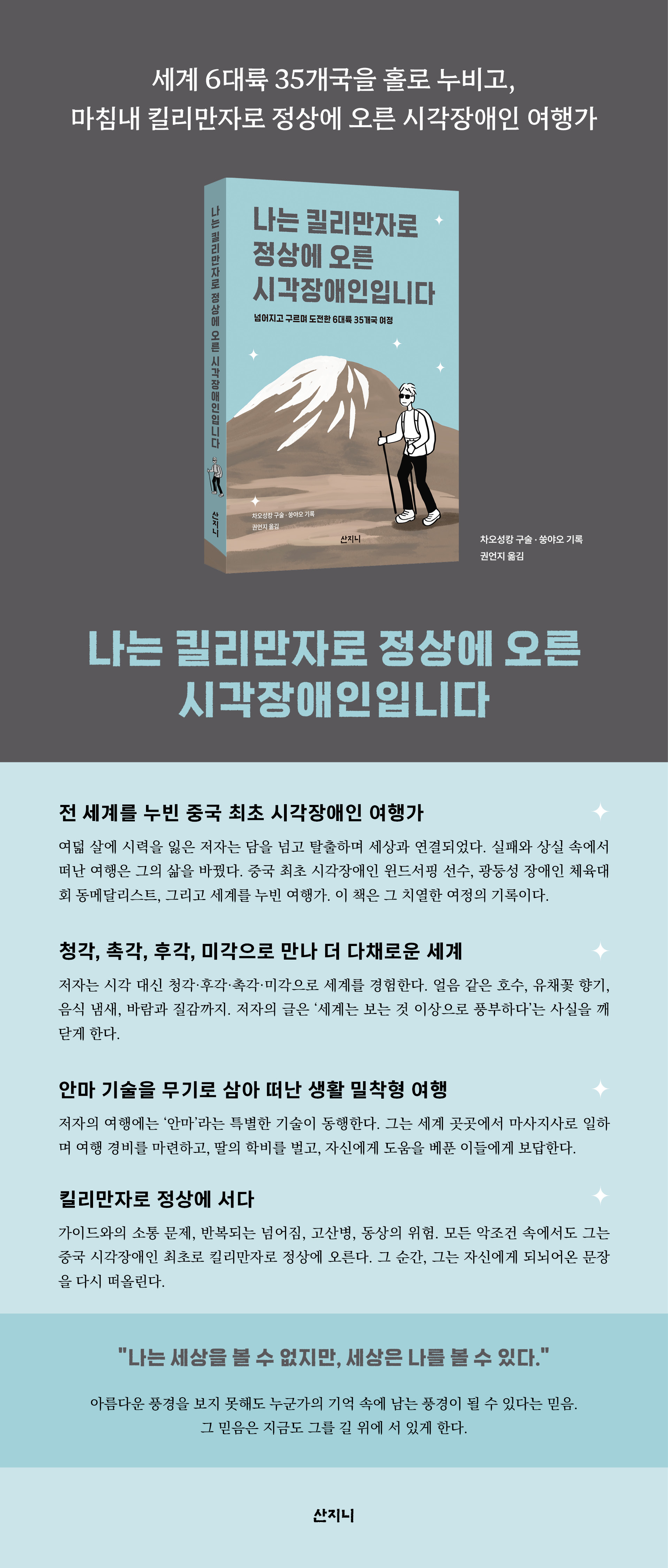 광둥성 장애인체육대회 단거리 달리기 동메달리스트, 중국 최초 시각장애인 윈드서핑 선수, 그리고 6대륙 35개국을 누빈 여행가. 이 모든 타이틀을 가진 그가 마침내 킬리만자로 정상에 서기까지의 여정이 담겨 있습니다.
