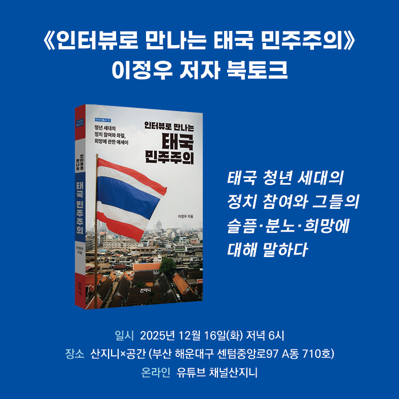 이번 북토크에서는 태국 청년 세대의 정치 참여, 왕실모독죄를 둘러싼 민주화 운동, 그리고 국제 연대가 필요한 이유까지 현장에서 뛰며 기록한 저자의 생생한 경험을 들으실 수 있습니다. 많은 관심 부탁드립니다!