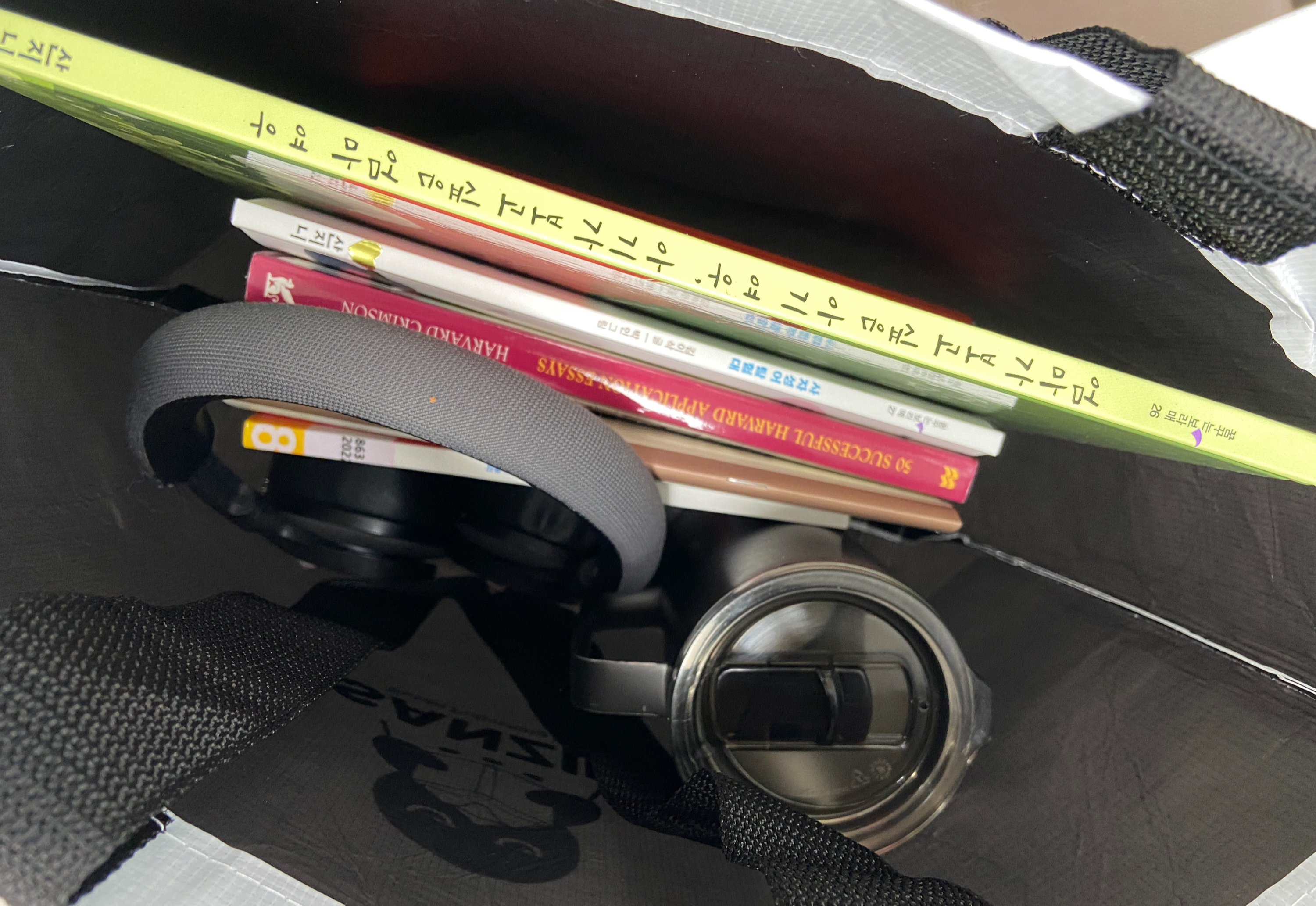 책과 굿즈, 다이어리, 텀블러는 물론 헤드폰까지 여유 있게 들어간답니다. (판형이 큰 동화책도 완전 가능!)