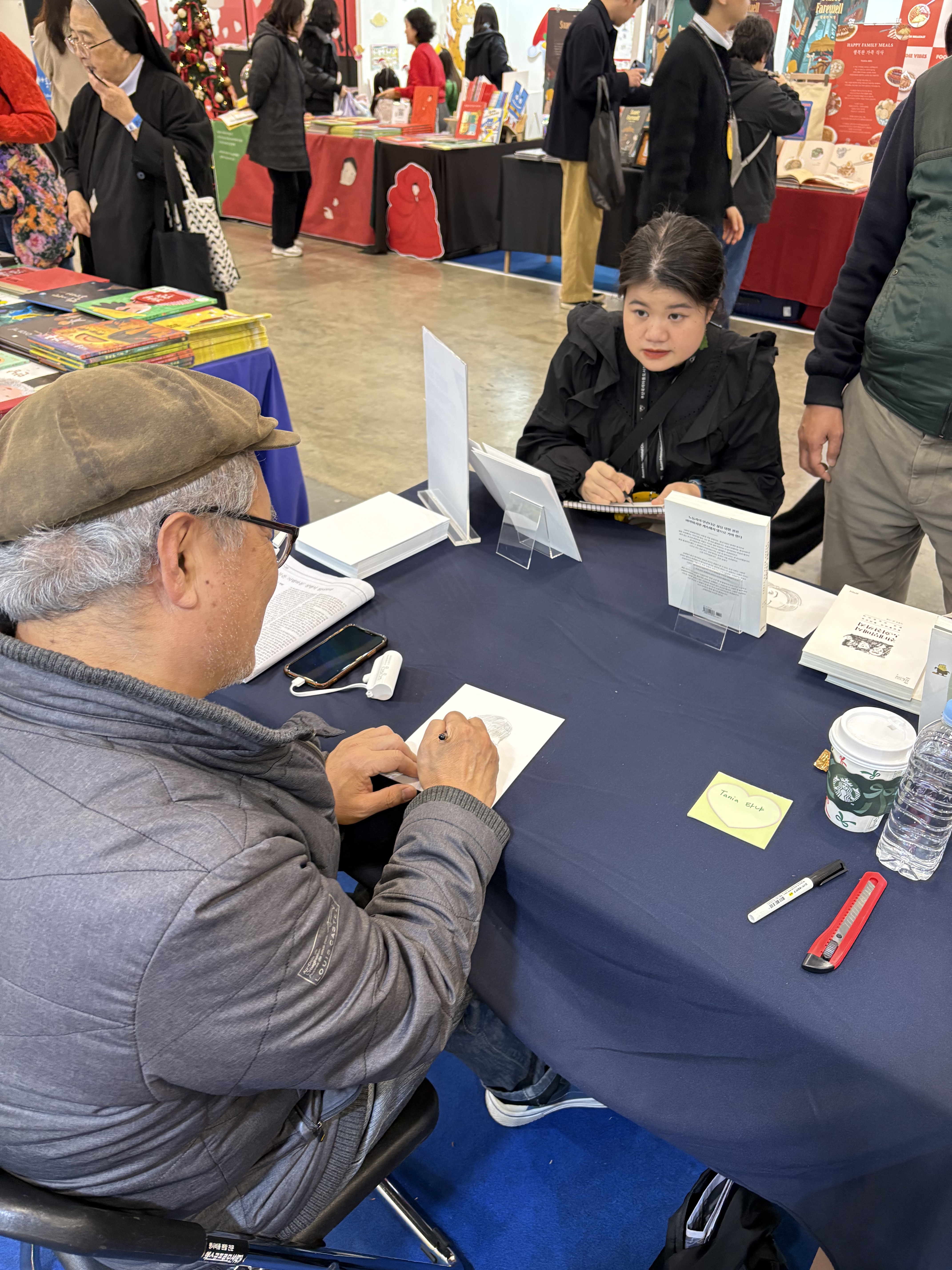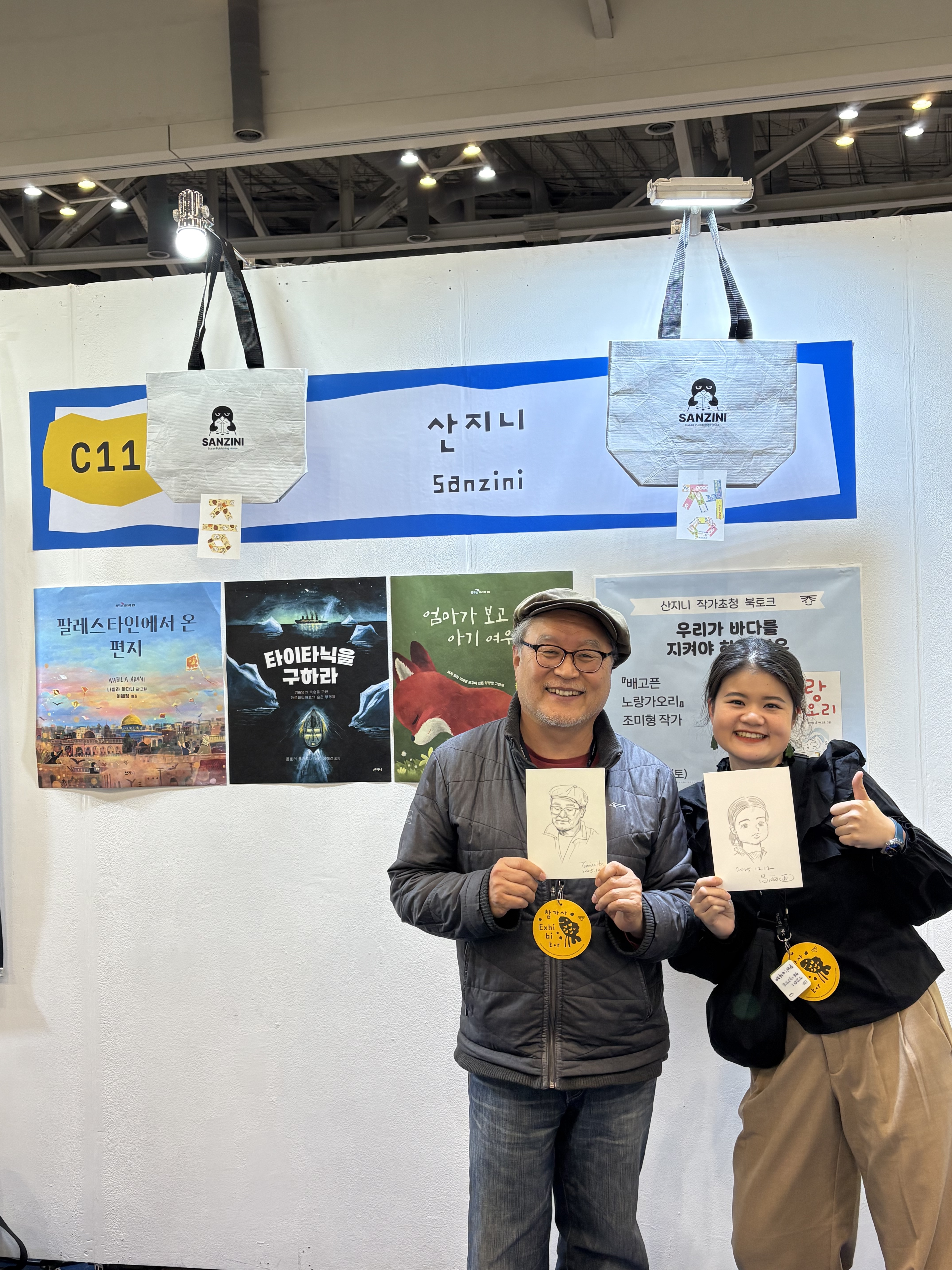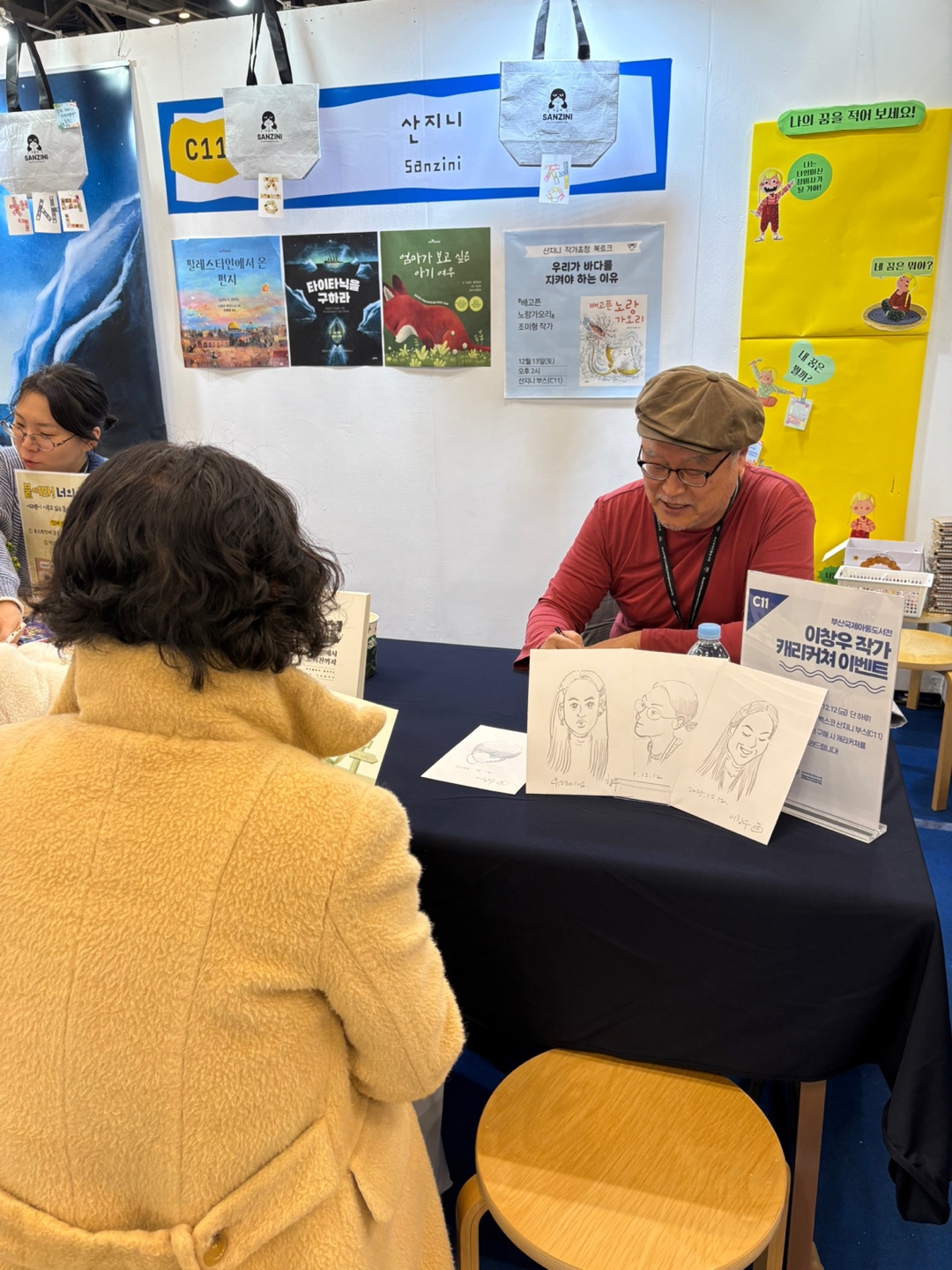 산지니 바로 앞 부스였던 대만 출판사 <쉬충마오 스튜디오> 작가님도 캐리커쳐를 받으셨어요. <한나 아렌트의 작은 극장>을 해외 도서전에서 원서로 보았다면서 반갑게 구매하셨는데요. 이창우 작가님께 캐리커쳐를 받는 동안 자신도 이창우 작가님을 그려드리고 싶다며, 서로를 그려 교환하기도 하였습니다. 이런 교류가 또 국제도서전의 묘미이겠지요? 이후 도서전이 끝나는 6시까지 정말 많은 분들이 캐리커쳐를 받고 가셨어요. 작가님께도, 또 캐리커쳐를 받은 관람객분들에게도 좋은 추억이 되었기를 바랍니다.