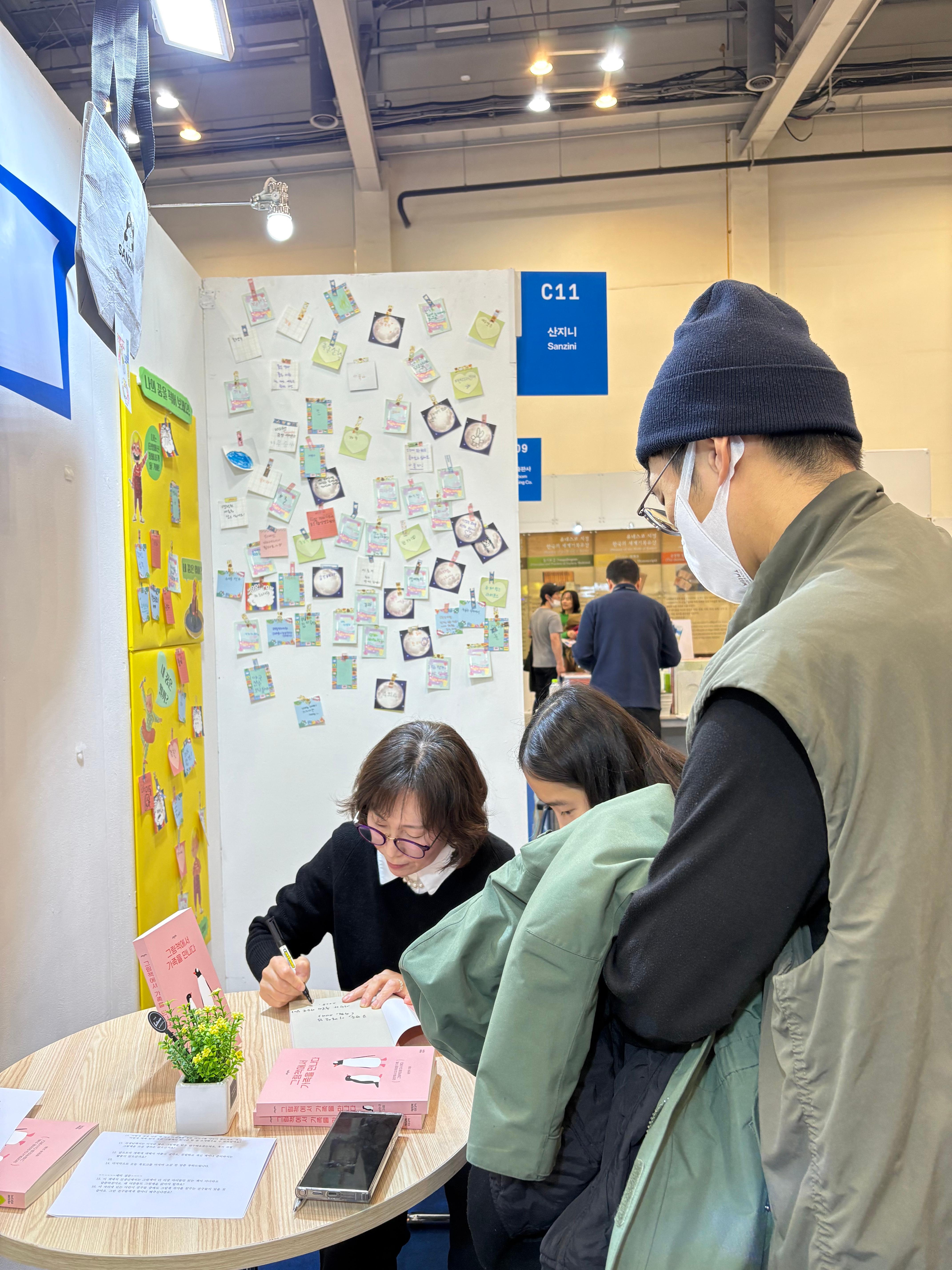 북토크 직후 <그림책에서 가족을 만나다>를 사가시는 관객분들과 사인회 시간도 가지며 2025 부산국제아동도서전 셋째 날 마지막 북토크는 따뜻하게 마무리되었습니다. 조금 더 현장감 있는 북토크 현장을 보고 싶으시다면 유튜브 채널 산지니에 방문해주세요! 감사합니다:)