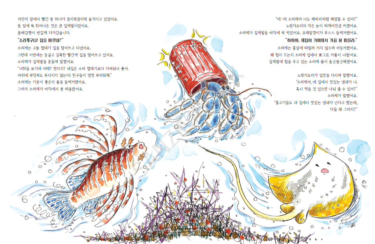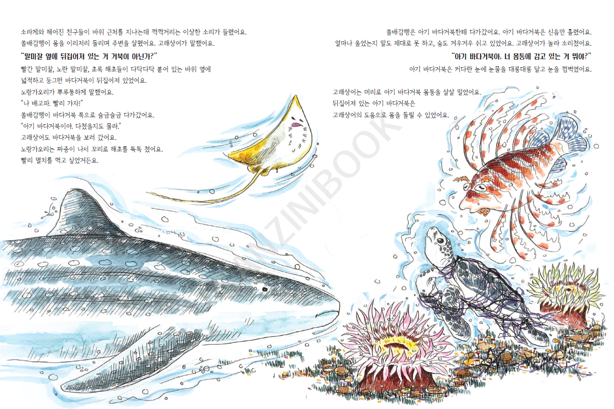 배가 몹시 고프지만 주변에서 먹이를 찾을 수 없었던 노랑가오리가 친구인 쏠배감펭, 그리고 고래상어와 함께 먹이를 찾아 나섭니다. 오늘 처음 만나는 것은 멸치 떼가 아니라 하얀 알갱이를 만나거든요. 이 알갱이는 무엇일까요?