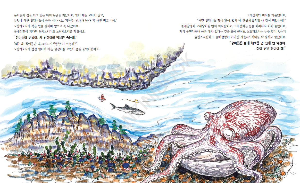 그러면 이제 선생님께서 낭독해 주시는 <배고픈 노랑가오리> 들으면서 작품에 대한 이야기를 계속 나눠보겠습니다. 노랑가오리가 친구들과 먹이를 찾아 떠나는 장면입니다.