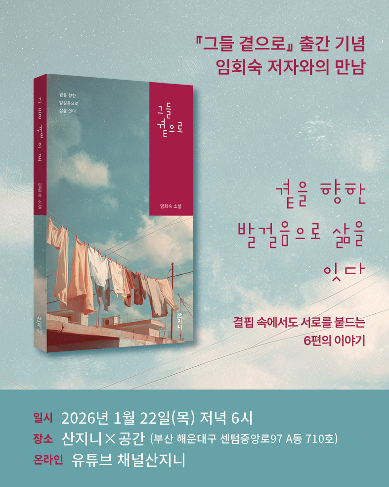 벌써 2026년 새해를 맞이하였습니다. 서류에 날짜를 적을 때 5를 6으로 바꾸는 게 아직 어색하네요. 날씨도 이제 제법 겨울 같습니다. 걸어서 출퇴근하는 저는 매일 아침 현재 온도를 보며 오늘은 걸어갈지, 버스를 탈지 고민하곤 합니다. 또 새해가 되면 꼭 하는 올해 목표 세우기를 해야 하는데, 미루고 있어 마음이 급합니다. 독자 여러분은 새해에 세운 목표를 잘 지켜나가고 있나요? 산지니는 올해도 독자들에게 의미 있고 재미있는 책을 소개하기 위해 열심히 달리고 있습니다.
