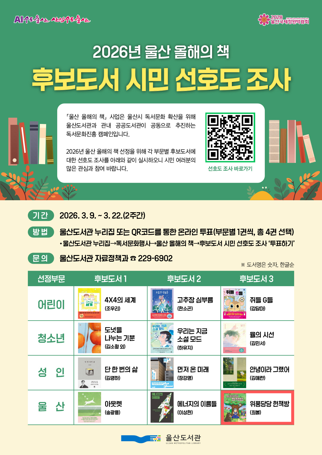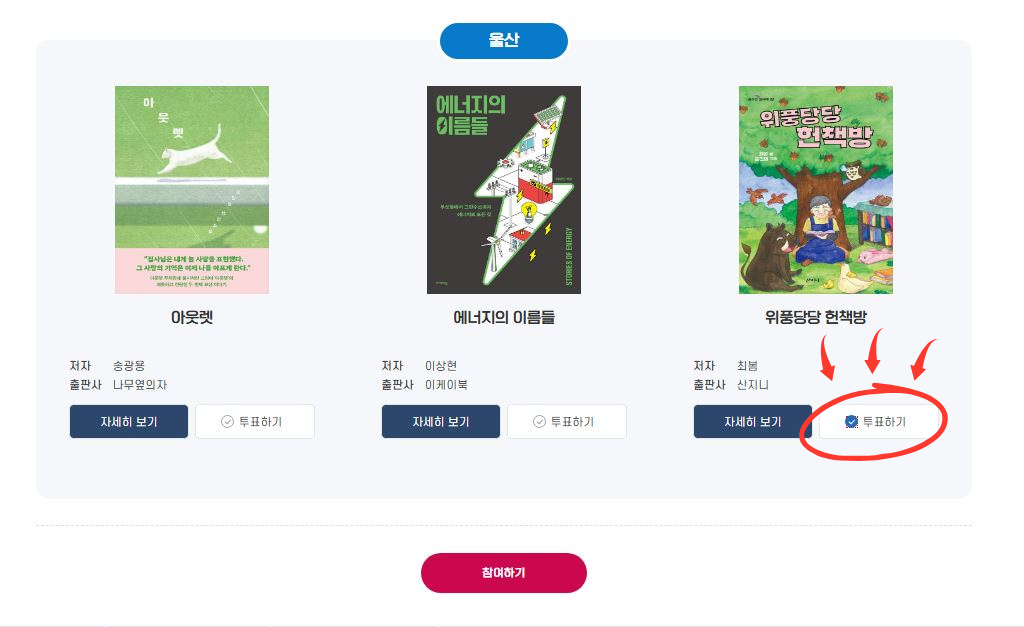 후보도서 시민선호도 조사 홈 독서문화행사 울산 올해의 책 후보도서 시민선호도 조사 후보도서 시민선호도 조사 --> 2025년 「북(Book)적북적 울산, 올해의 책」 시민 선호도 조사 올해의 책 선정