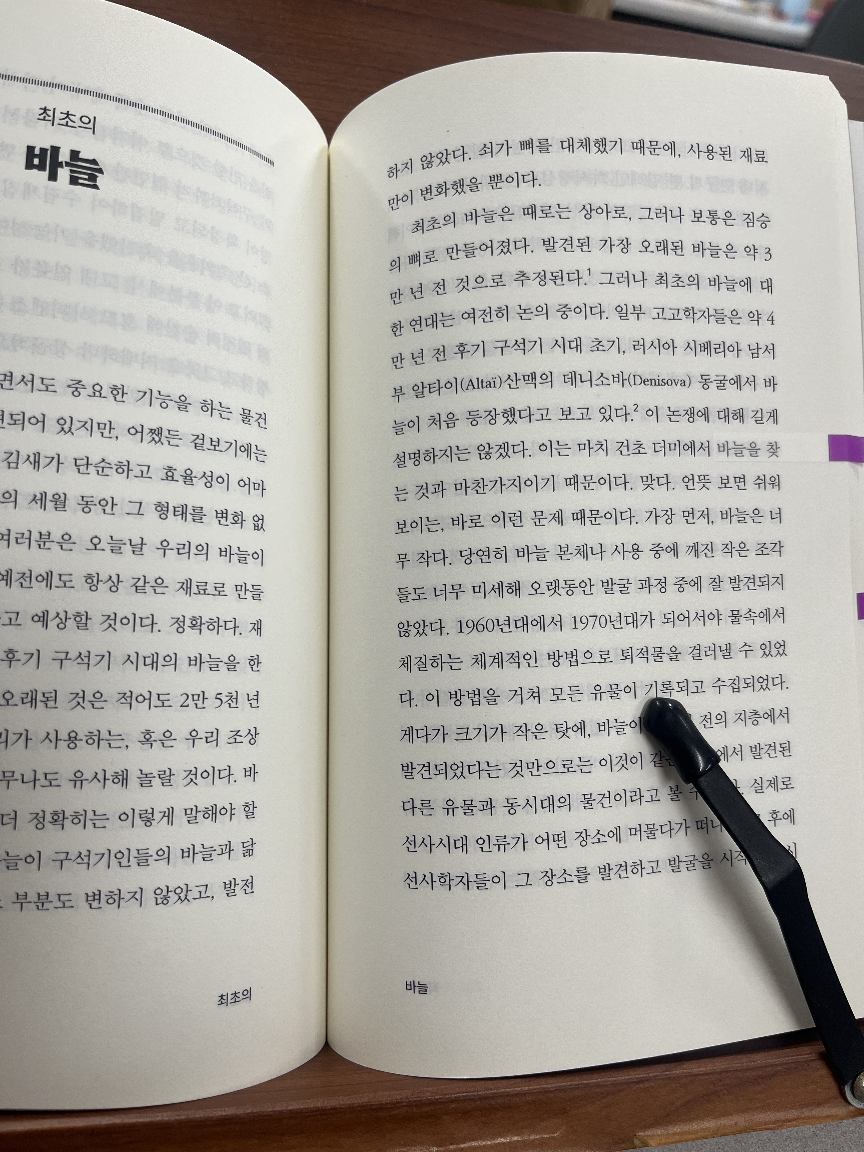 저자에 따르면 후기 구석기시대에 사용하던 바늘 중 가장 오래된 것은 적어도 2만 5천 년 전의 바늘이다. 오늘날 바늘과 다른 점은 재료가 뼈에서 쇠로 변했다는 것과 바늘이 재봉틀에 붙었다는 것뿐이다. 섬세한 바느질을 요구하는 게 인류의 오랜 관행일지 모른다는 사실도, 구석기시대에 사용한 바늘이 오늘날과 크게 다르지 않다는 사실도 놀랍지만 또 다른 질문들이 꼬리를 물었다. 현재 기술이 정말 역사에서 정점일까? 고고학은 수만 년 전 세상 역시 나름 세계에 대한 이해를 바탕으로 기술과 질서를 가지고 있었음을 알려준다.